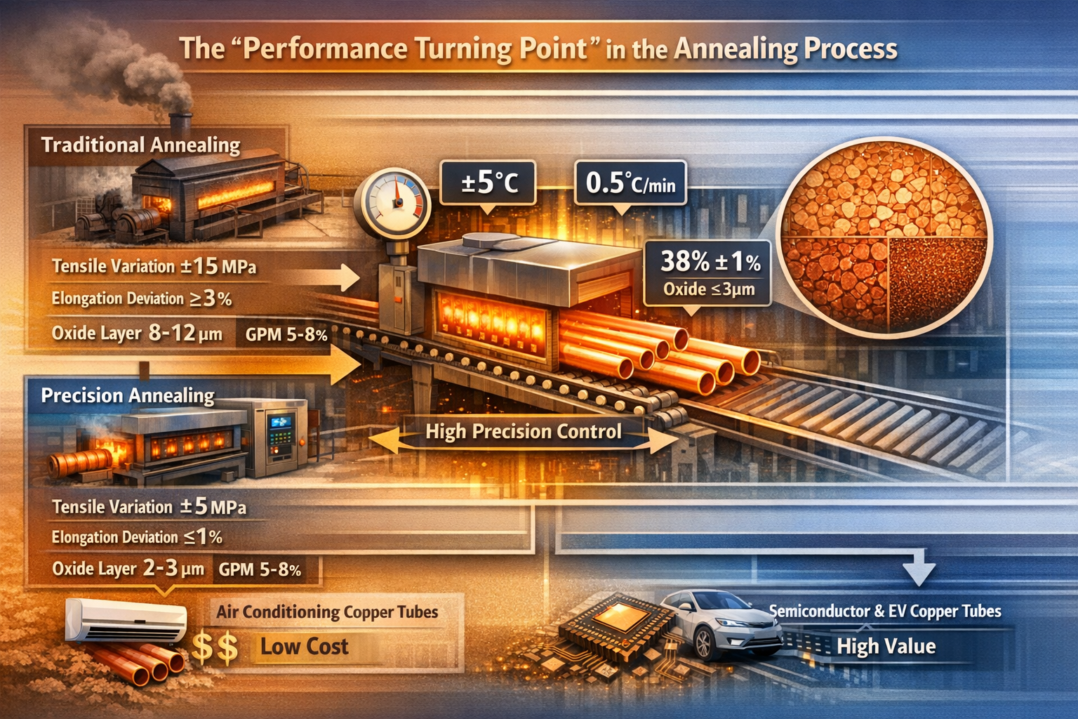 アプリケーションシナリオの観点から見ると、アニーリングプロセスの詳細の違いが製品の市場セグメントを直接決定します。エアコン用の従来の銅管は焼きなまし精度の要件が低く、従来のプロセスで要求を満たすことができます。これらの製品の粗利率はわずか 5% ~ 8% です。しかし、半導体用の極細銅管や新エネルギー車の熱管理用の薄肉銅管では、焼鈍後の製品が靭性や熱伝導率の基準を満たすだけでなく、極めて高い性能の安定性が求められます。精密焼鈍工程のみで量産が可能であり、粗利率25%~40%を実現します。半導体装置メーカーの調達基準では、適合する銅管のアニール後の伸びは38%±1%で安定しており、酸化層の厚さは3μmを超えてはいけないと定められています。輸入されたアニーリング装置を使用している国内企業のうちこの基準を満たすことができるのはわずか数社だけですが、従来のプロセスに依存しているほとんどの企業はハイエンドの注文を逃しています。