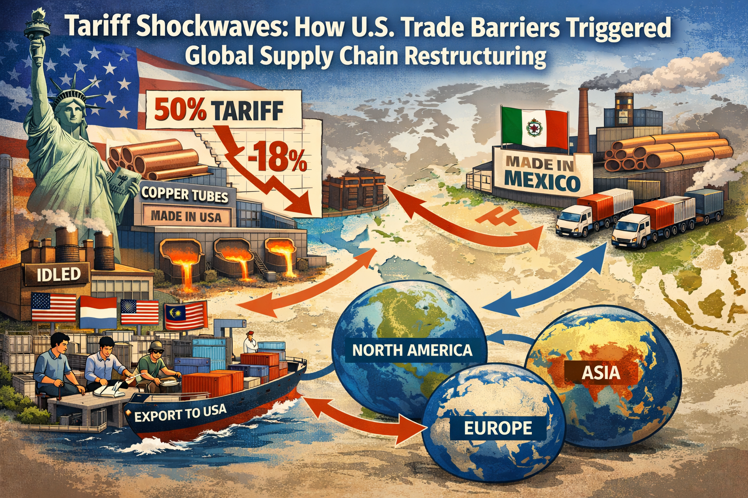 副題: 米国が銅管に50%の関税を課し、世界的な貿易チェーンの再構築を引き起こしたとき、東南アジアとメキシコの生産能力はどのようにして1年以内に46.3%も急増したのでしょうか?この政策主導のサプライチェーンの移行により、銅管の世界的な価値分布図が塗り替えられています。
