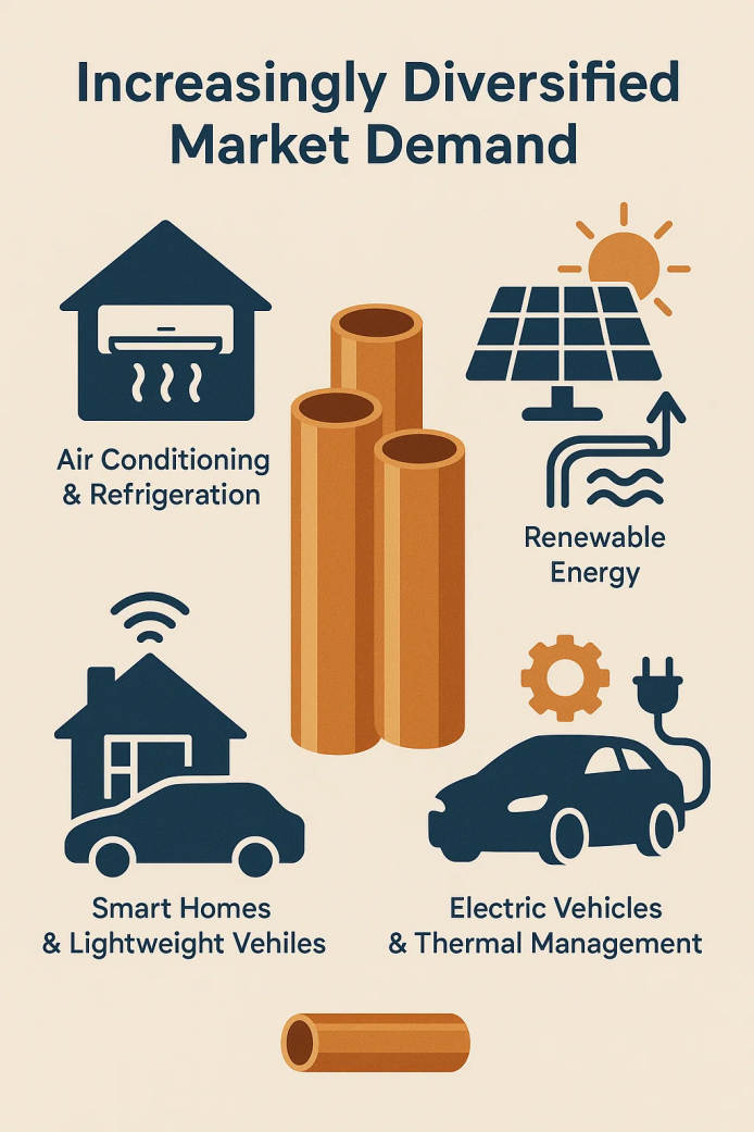 スマートホーム、軽量車両の開発、および電化により、銅管のアプリケーションシナリオも拡大しています。高性能銅管は、家電製品のコンデンサーと蒸発器のコアコンポーネントであるだけでなく、新しいエネルギー車の熱管理システムにおいて重要な役割を果たします。この市場は成長し続けると予想されています。