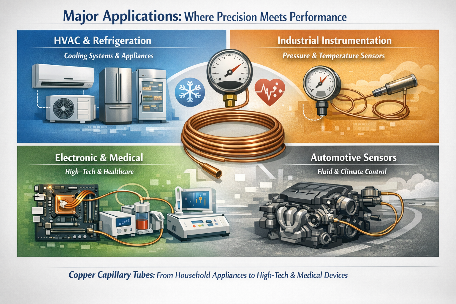 銅毛細管の最も一般的な用途は、HVAC (暖房、換気、空調) 業界です。プライマリとして機能します 計量装置 中小規模の冷却システムに。