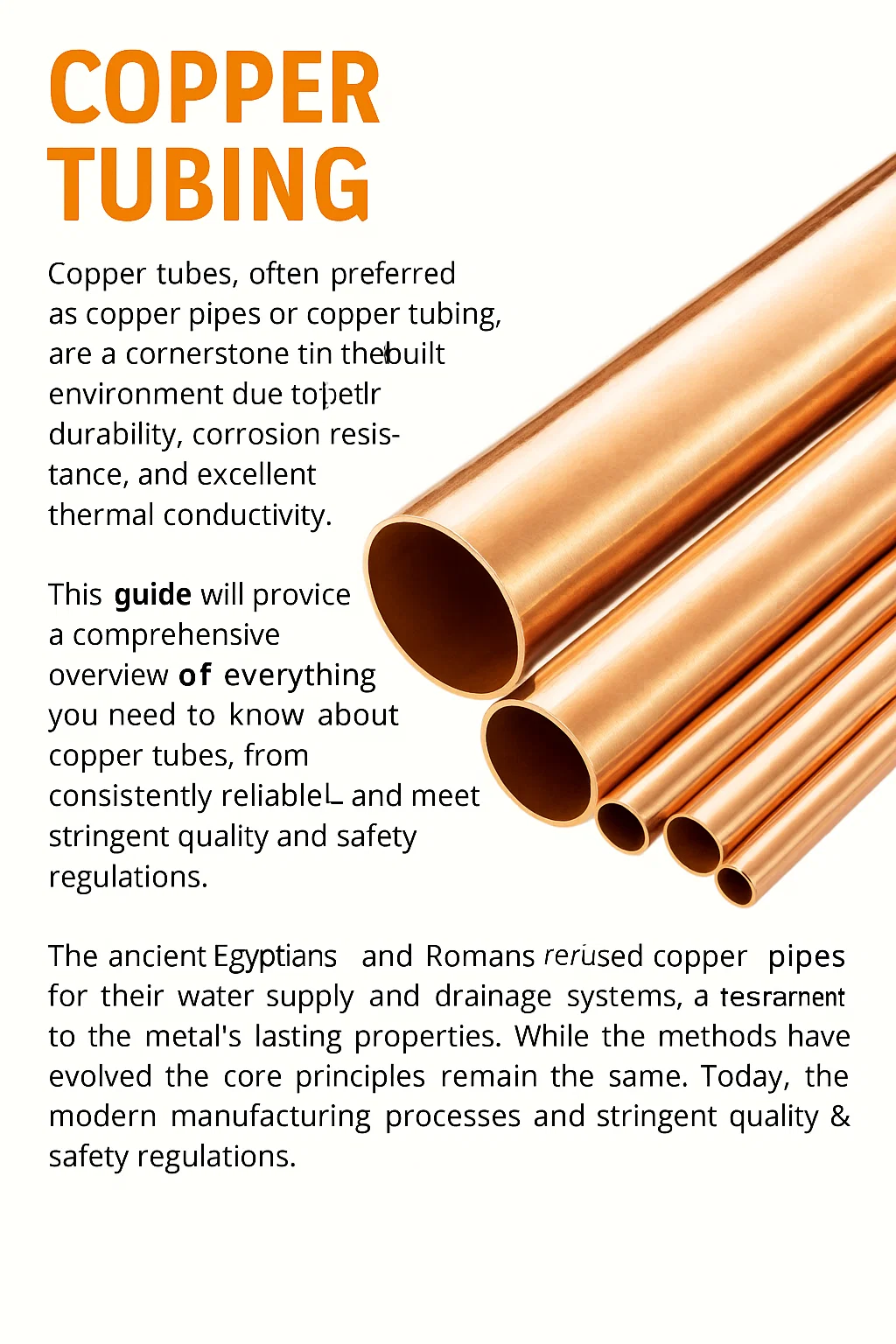 水を輸送するための銅の使用は、数千年前にさかのぼります。古代エジプト人とローマ人は、金属の永続的な特性の証である給水と排水システムに銅パイプを使用しました。方法は進化していますが、コア原則は同じままです。今日、最新の製造プロセスと標準化されたプラクティスは、銅管が一貫して信頼できることを保証し、厳しい品質と安全規制を満たしており、それらを構築された環境の重要な要素にしています。