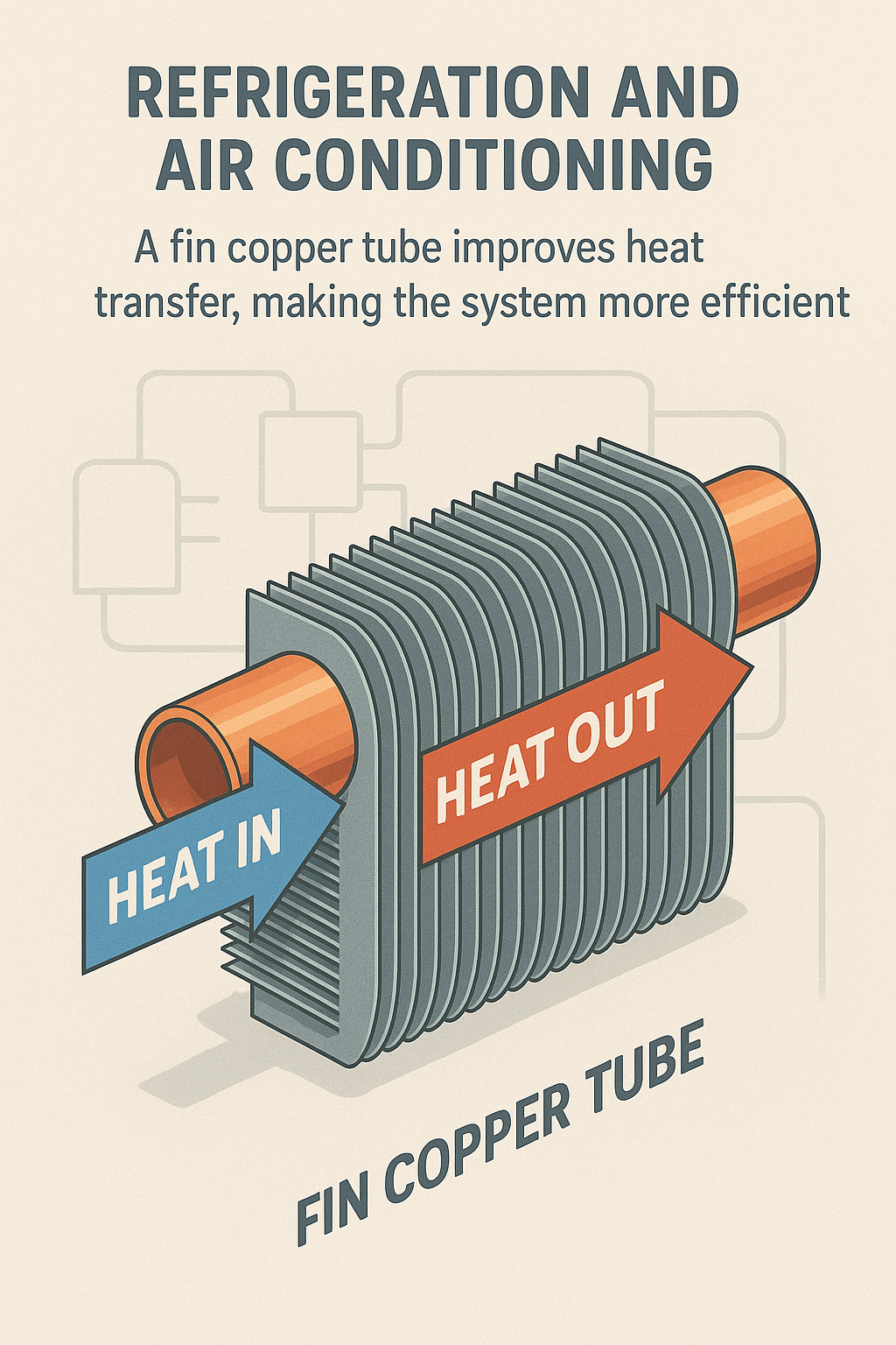 食品保管ユニットから産業用冷凍システムに至るまで、フィン銅管は効率的な温度制御を維持するために不可欠です。商業用および家庭用の冷蔵庫、冷凍庫、さらには産業用冷却システムにおいても、銅管はエネルギー使用を最小限に抑えながら低温を維持するのに役立ちます。フィン銅管は、 熱交換器 これらは冷凍サイクルに不可欠であり、システムが最高の状態で動作することを保証します。